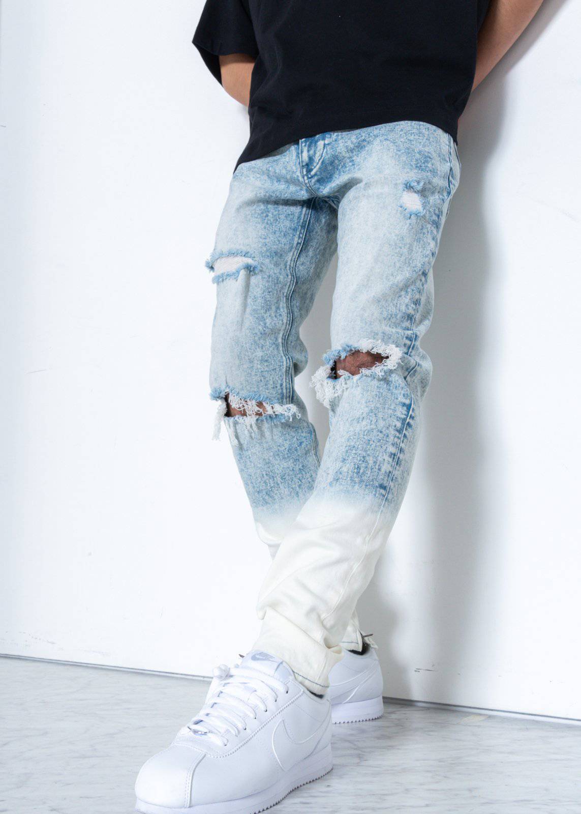 Slim tapered blue denim with acid wash and ombre bleaching at bottom features zippers at inseams and rips on thighs and knees