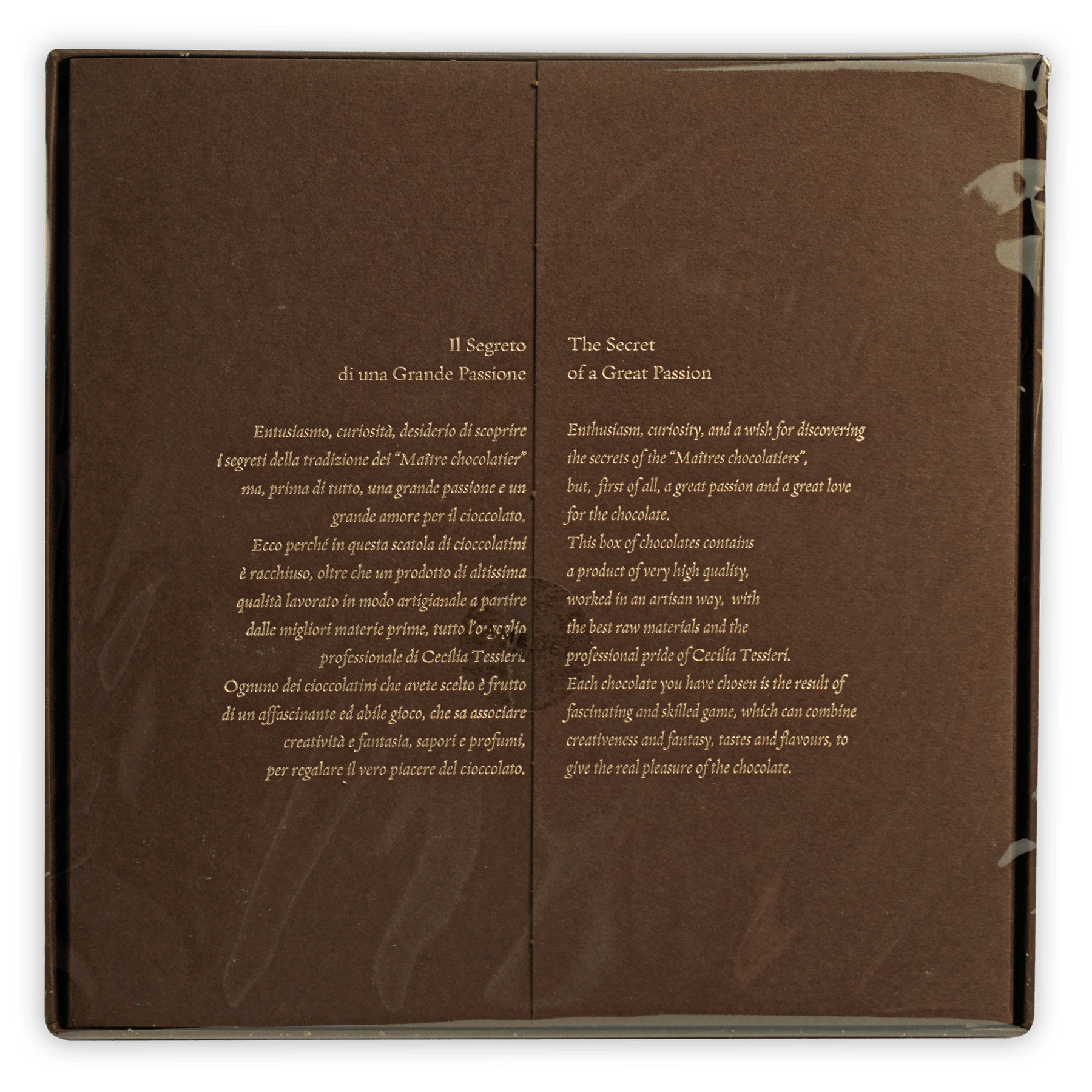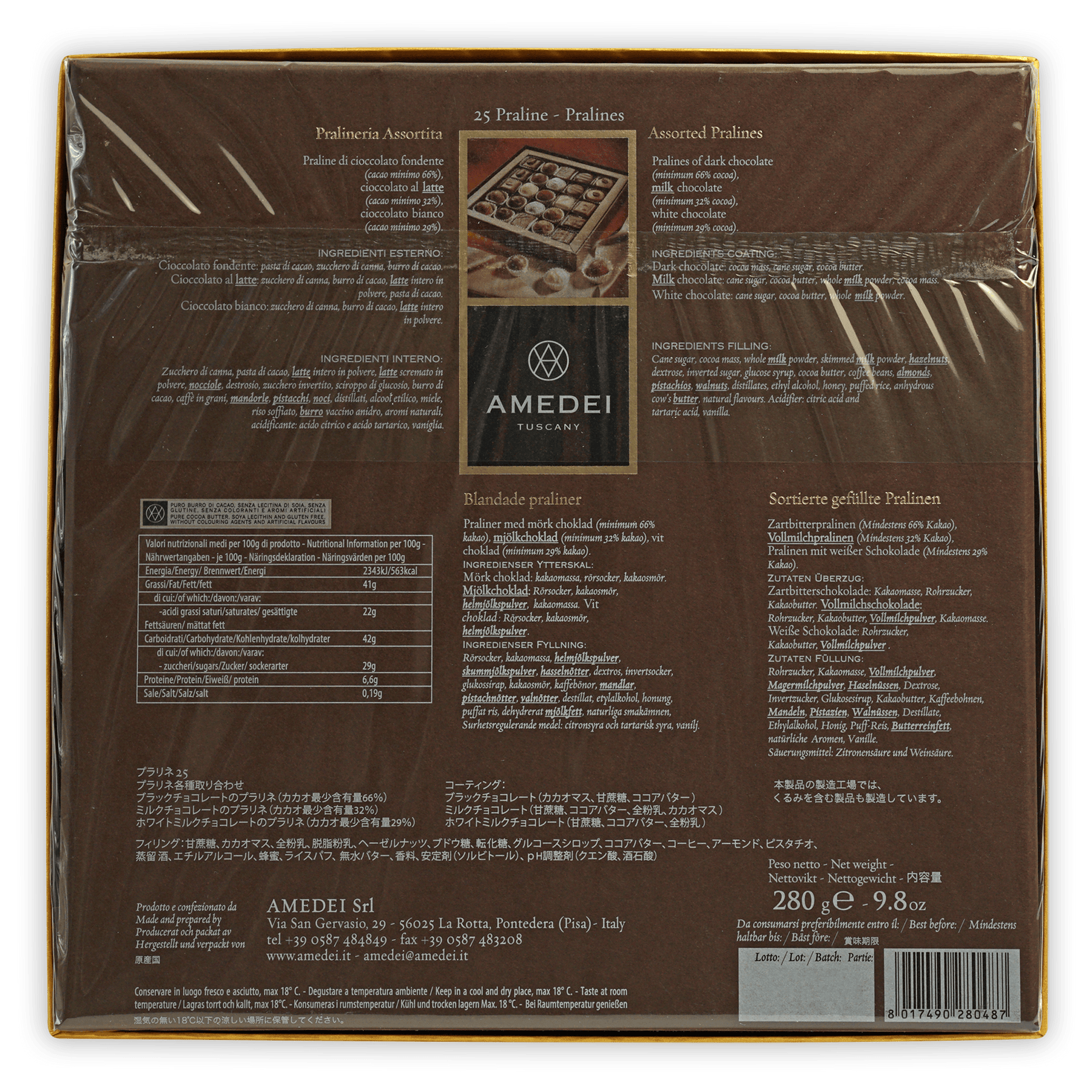This box contains the following: Desiderio (pistachio, marzipan), Noixorange (walnut, orange), Amor (macaroon), Toscanello (cinnamon), Mignon (mandarine), Croccantino (hazelnut, almond), Amandola (almond), Solare (zabayon - alcohol), Tartufo (hazelnut, almond), Delizioso (hazelnut cream), Vin Santo (vin Santo - alcohol), Supremo (coffee), Amandola (almond), Passione (rum - alcohol)), Capriccio (grappa - alcohol)
