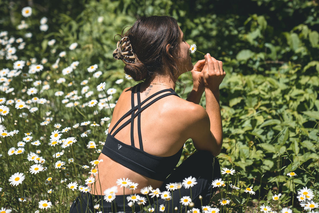 A sports bra that does it all! This sweat-wicking cross-strap bra gives you the coverage and support you need for yoga, run, and the gym without restricting your movement or breath. This bra is created for your next adventure! Features pockets for optional, removable cups and provides medium support. Pairs nicely with all our Onyx bottoms.