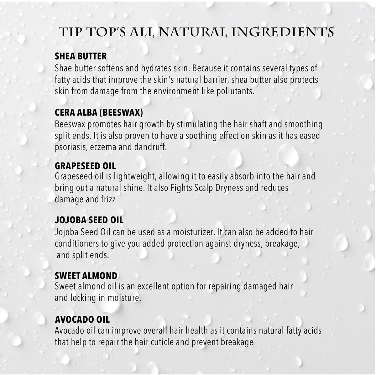 Tip Top's Cedar Beard Balms all natural ingredients condition and shape your beard without leaving a greasy finish. By keeping your beard moisturized, you'll cut down on unruly hairs and ensure your beard is always in Tip Top Shape It also has a mild woodsy cedar scent that is not overpowering.