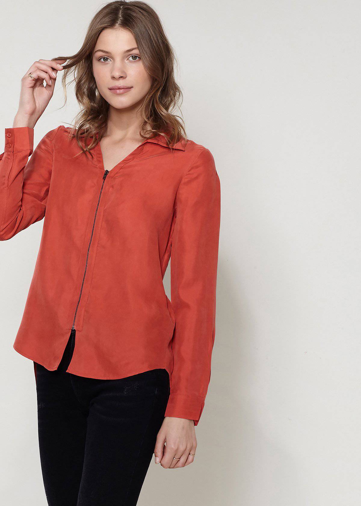 Standard collar zip up closure hi-lo hem long sleeve with button cuff