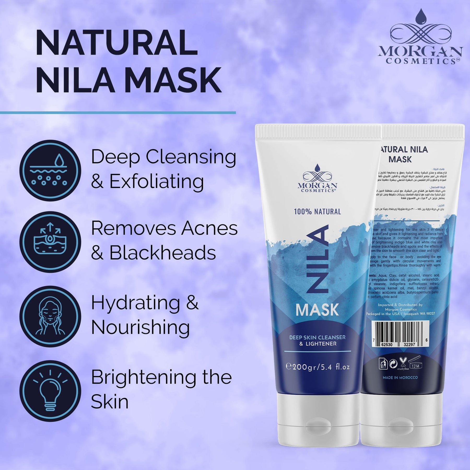 Mask Cleanser and lightening for the skin is deeply cleanses the skin and gives it lightening and radiance from the first use because it contains the most important elements of brightening indigo blue and white clay. The blue Nila plant is found in the Moroccan Sahara Desert. Â Also it helps to remove blackheads and spots and effects of the sun from the skin to smooth the skin clear and tight.